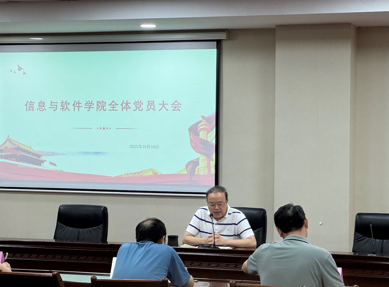 金秋十月,丹桂飘香,在中华人民共和国成立76周年的喜庆氛围中,信息与软件学院党总支于2025年10月10日召开全体党员大会。本次大会旨在深入贯彻全面从严治党要求,加强党风党纪教育和廉洁文化建设,激励全体党员教师以更加饱满的热情和昂扬的斗志投身于学院发展和国家教育事业。会议由学院党总支书记周肖兴主持,学院领导班子及全体党员教师参加。